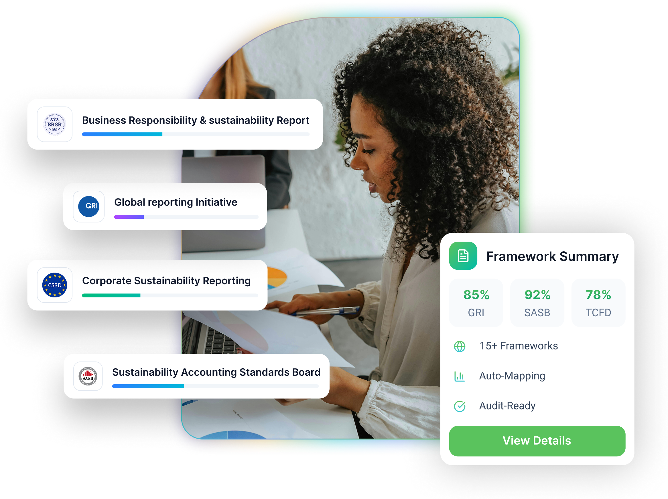 We help you streamline contributors with role-based collaboration, maintain data integrity through automatic GHG integration (Scopes 1–3), and ensure accuracy using cross-framework mapping (GRI, CSRD/ESRS, BRSR, CDP).