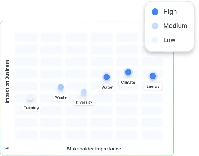 Our platform ensures targeted, compliant, and data-driven sustainability disclosures by assisting you in setting thresholds, prioritising important issues, and connecting subjects to performance metrics and regulations.