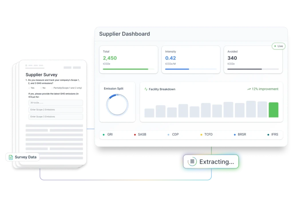 We help you streamline contributors with role-based collaboration, maintain data integrity through automatic GHG integration (Scopes 1–3), and ensure accuracy using cross-framework mapping (GRI, CSRD/ESRS, BRSR, CDP).